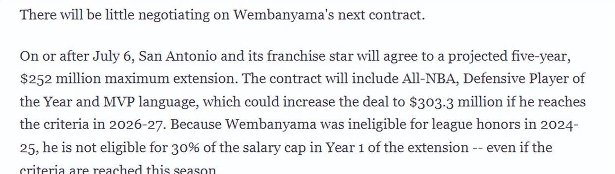 文班亚马目前仍处于新秀合同的最后一年。 由于他在2024-25赛季因伤仅出战46场比赛,没有资格参评联盟奖项,即便本赛季达成相关标准,他续约合同第一年的薪资也无法占到工资帽的30%。 但这并不影响他在未来几年成为联盟收入最高的球员之一。